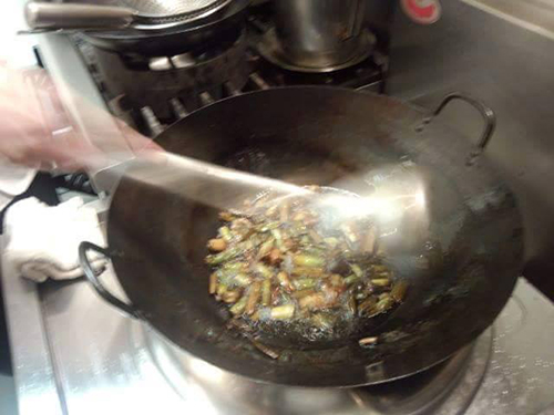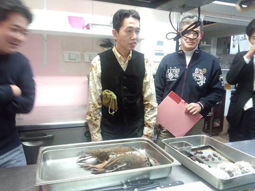 ビストロチャイニーズ ロン 入江を講師役とした授業のテーマは「中華の油」。もともとはラードが主流であったが近年はほとんどがサラダ油。北の地方のほうが油を多く使う。ラー油も、もともとはサラダ油。油に香りをうつす時には「沸かした油に素材をかける」「なべの中で素材と油と炊く」という2つの手法がある。料理は「菊の甘酢漬け(酢・砂糖・塩)→青山椒の油で味にアレンジを加えていく」「ねぎ油の作り方」「皮付き豚肉のロースト焼肉(しゅうよう)→軽くボイル、その後は塩・砂糖・チキンパウダー・五香粉をすりこむ」が調理された。