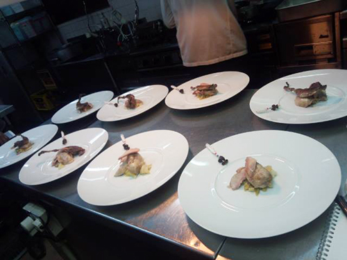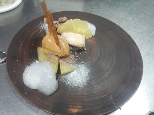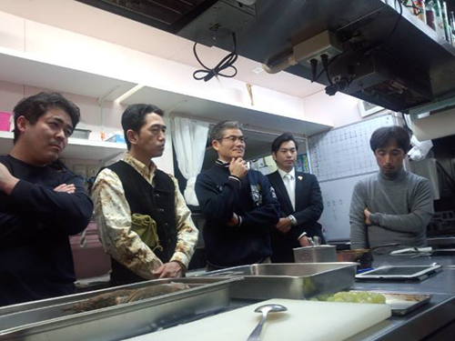 エタンセールカワモト 川本が講師役となりジビエの種類や、温度管理と熟成の方法、スチーム・コンベクションオーブン、パコジェット(冷凍粉砕調理器)、ブラストマスターといった調理器具の説明とあわせて勉強を行った。料理は、ジビエをフォンドボーをベースにフォアグラとベルドーロのレバーを繋ぎにしたとろみのある濃厚なソースで、フルーツを付け合わせに試食。ワインには熟成のきいたブルゴーニュが合う、といった説明も塚里ソムリエからあった。
