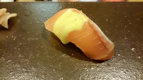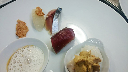 1月のコラボレーションのリベンジとして同じ組合せで再挑戦。メニューは「カマスは塩をして焼き霜に(ヘーゼルナッツ、オリーブオイル+カボスポン酢、マイクロベビーリーフ)」「鰺、エシャロット、肥後味噌、温野菜は塩ゆでしてオリーブオイル和え」「鴨ロースト、薬味は白ネギ、浅葱、生姜醤油」「西米良サーモンの昆布締め、オランデーズソース」「サーモン燻製漬け」。