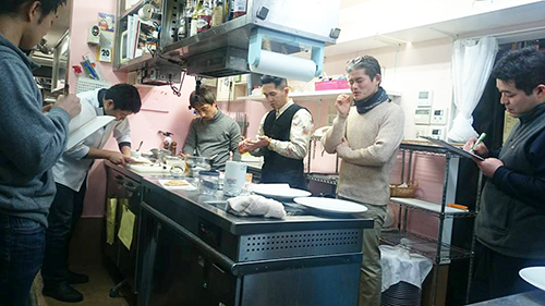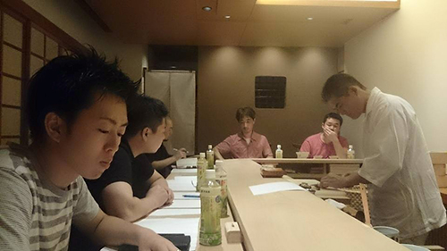 初の主催イベントを終えての意見交換会が実施された。「完成度が高かったが、お酒は日本酒メインのほうがよかったかもしれない。最終的なご飯はバターライスではなく、白ごはんでもよかったのかも」「サービスが大変勉強になり、最後はおなかいっぱいになった」「一斉スタートではないのに流れがスムーズで全体的に感動したが、少し量が多かった」「オーダーを通す人間がはっきりしていなかった」「スタートがバラバラだったのでまとめてオーダーがかけられなかった。料理のオーダーを合わせるのは難しかった」「メニューのフォーマットは今回のものを基礎に見開きでメニュー+ドリンクメニューを用意するのなどの配慮があればよかった」といった意見が、八頭会メンバーと担当2店のスタッフメンバーから挙がった。