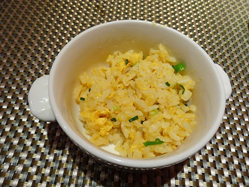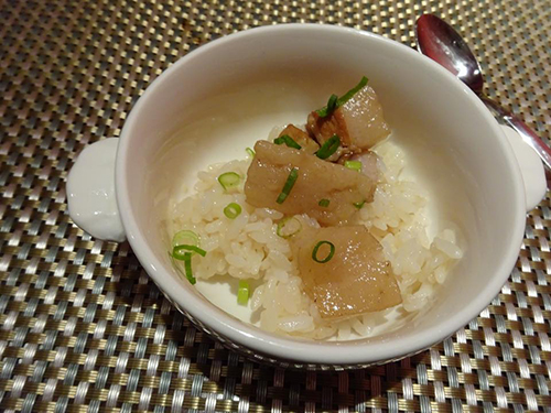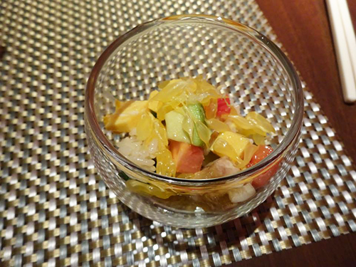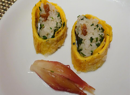 当日のメニューは「舎利のサラダ仕立て(舎利×豚肉の煮こごり×卵焼き×トマト×アボガド)」「舎利の玉子春巻き(舎利×香草×かんぴょう)」「魚羹スープの寿司」「舎利の豚肉のせ」「炒飯」など、江戸前鮨と中華料理をコラボレートさせた内容となった。