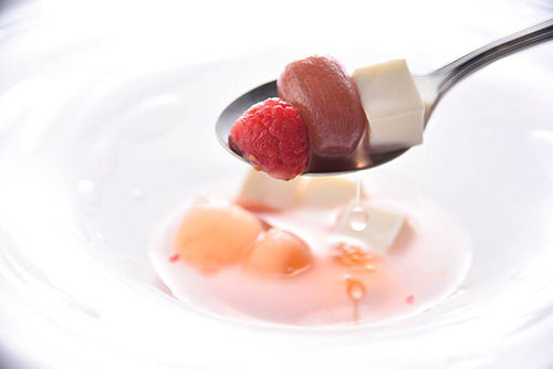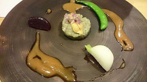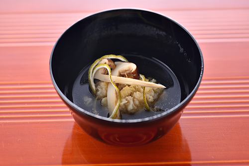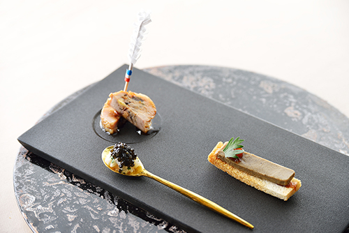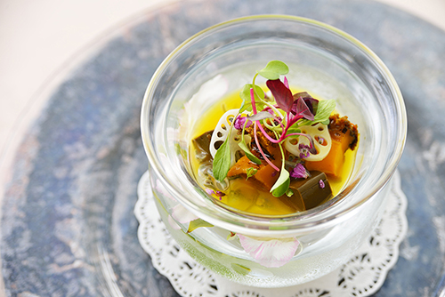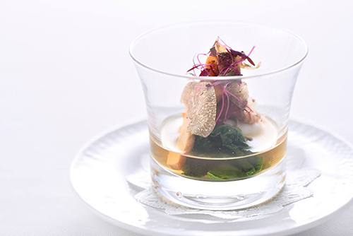 当日のメニューは「コンソメを酢の物仕立て 春野菜と」「スクランブルエッグとホワイトアスパラ 蕗の茎」「トラフグの煮こごり ふぐのエスプーマ」「フォアグラの田楽」「鴨味噌漬け」。「コンソメ×淡口醤油×生姜×カボス」「フグのダシ+柚子をエスプーマ」「フォアグラ×竹の子」「味噌×マーマレード」など和とフレンチ両方の技法をあわせたメニューが並んだ。