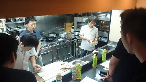 2015年最初の勉強会は寿司つばさとエタンセールカワモトのコラボレーションで、テーマは「フレンチの食材を用いた寿司」。お品書きは「赤ワインを使用したマグロの漬け」「カワハギの肝をパウダー状に…」「白子の握りにポン酢のムースリーヌ」「シードルビネガーを使用した鯖の〆」「渡りがにの茶碗蒸し ビスク風」。食材の組み合わせだけでなく、真空調理器・パコジェットといった新しい時代の調理器と、伝統の技を組み合わせることにも挑戦した。