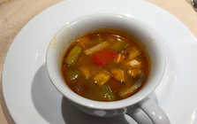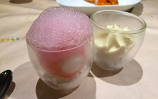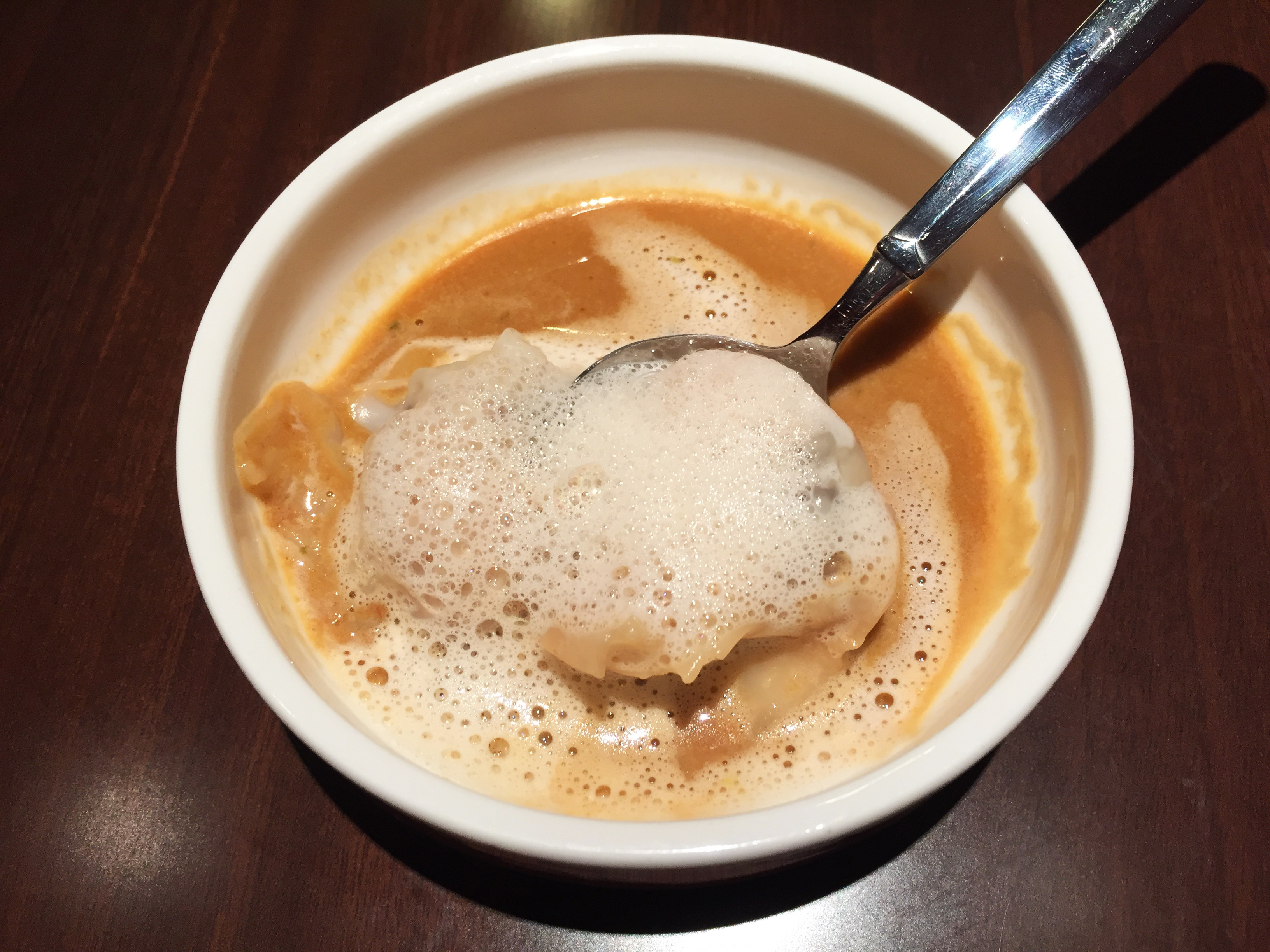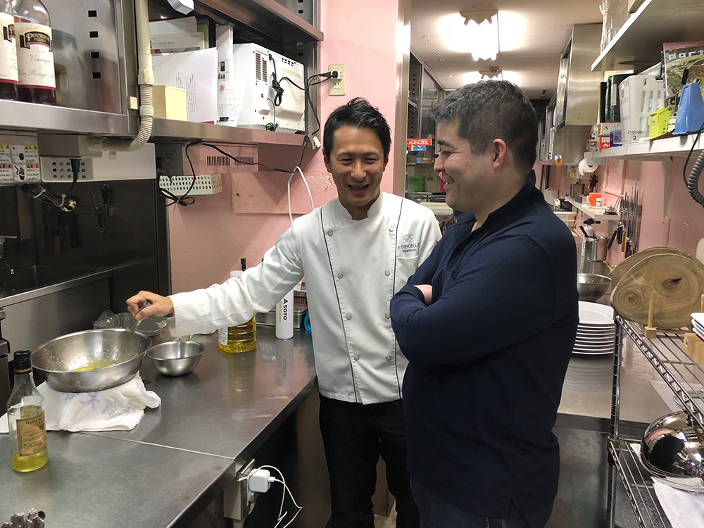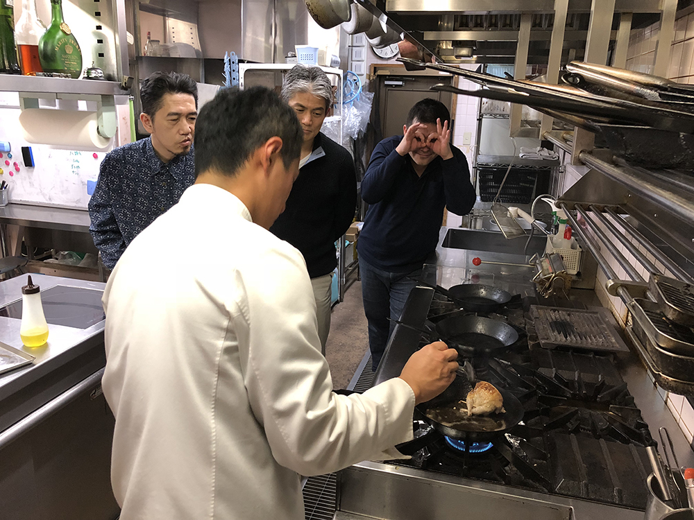 試食メニューは「 RONの薬膳蒸しスープ(干し椎茸、干し山芋、くこ、金華ハムなどを 3時間ほど蒸したスープに黒トリュフをいれて)」と「豚肉とエビのワンタンにエタンセールカワモトのソースアメリケーヌトシャンピニオンの泡で(ワンタンをラビオリと捉えて)」の2品。この試作料理に対して各料理人の視点からメニューについての意見交換を行い、 4月もエタンセールカワモトで継続してコラボメニュー試作を続けることになりました。
