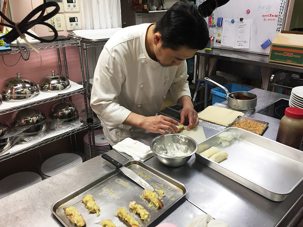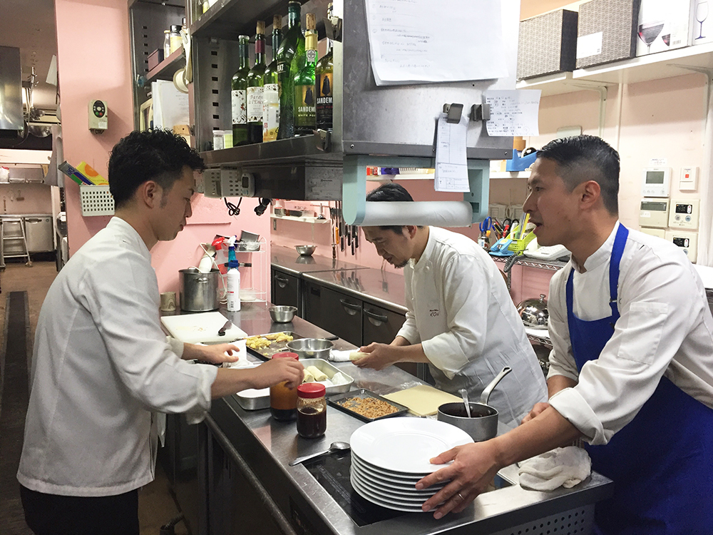 メニューは「フォアグラのソテーとキャベツの煮込みの春巻き」「うずらのローストと牛フィレのローストを中華のソースで(黒胡椒と沙茶醤ソース)」「プーアル茶のグラニテ」。試食後はメニューの完成度を高めるべく、各料理人からのアドバイスがあり、さらに当日に向けてのメニュー改良案を交換しました。