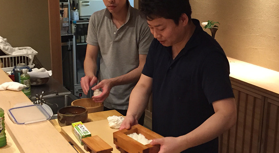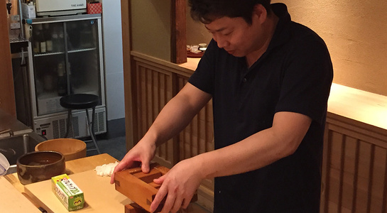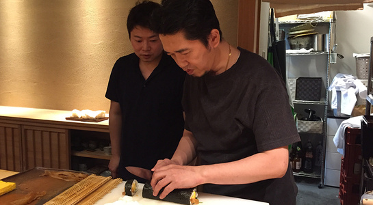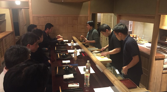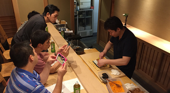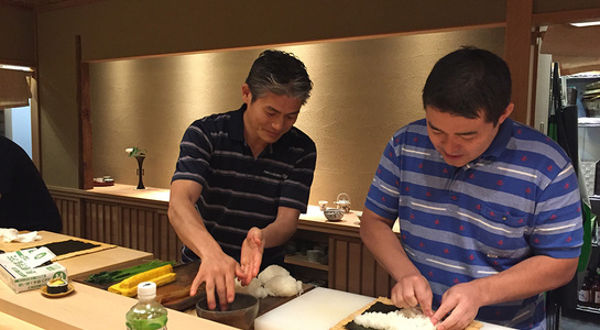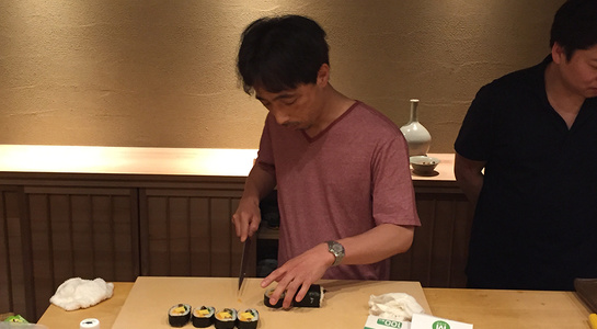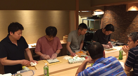 6月八頭会は寿司つばさにて巻き寿司と箱寿司の勉強会を開催しました。まずは、巻き寿司の「おぼろ」「椎茸」「かんぴょう」といった具材のつくり方、紙とタオルを使った巻き方の説明、実際の具材を使っての巻きから切るまでの実演後、メンバー各人も巻き寿司づくりに挑戦しました。(合間には江戸前鮨の二鶴さんとつばささんによる関西、関東の巻き寿司・太巻きの違いの話も。)