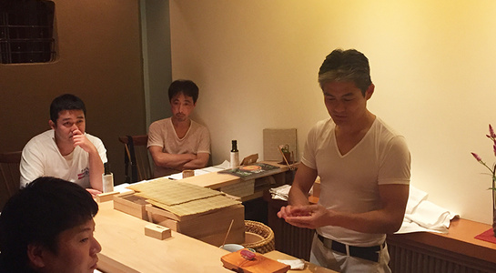 そして、同じマグロの赤身を3段階(当日、4日目、8日目)に日にちをわけて解凍保存させておき、味の違いを鮨で試食し、「食材と味の変化を化学的に考える」という8月の勉強会を終了しました。(この日は、おまけで「ハムとトマトの手巻き寿司」「魚だしの冷製ラーメン」のまかないも試食。)