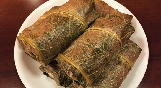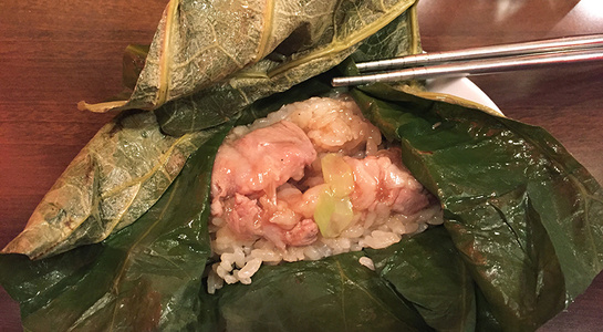 おまけは鮨のシャリと水で戻した乾燥したハスの葉を使った蒸し鮨、香港などで使われる発酵させた魚:鹹魚ハムユを使った蒸し鮨の2種類も。蒸すことで香りが変化する中華の技法を堪能できる授業でした。