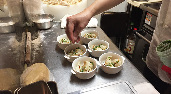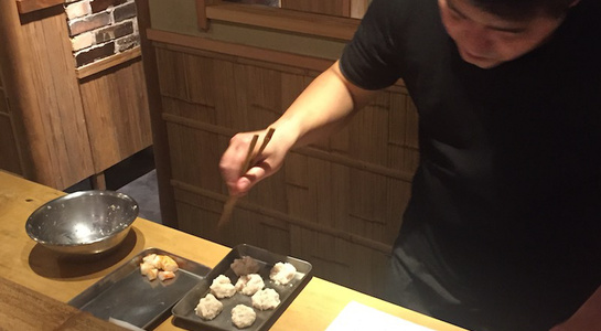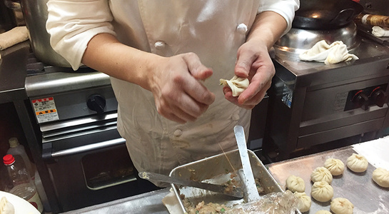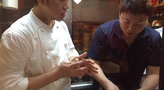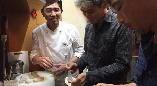 9月の八頭会はビストロチャイニーズRON、入江シェフの指導の下、点心を包む実技を開催。最初はオリジナルの餡をつかった餃子。餡をいかにしっかりと餡を包み込むか、ヒダを上手につくっていくのか、ということを直接指導でメンバーが一人一人実技を行いました。続いて、小籠包を皮からのばして餡を詰めていく作業を実演。フレンチ、寿司、和食と分野の違うメンバーは日頃の仕事とは違う料理の作り方がとても勉強になったようです。