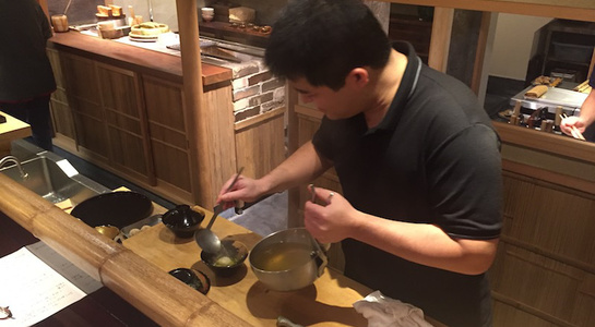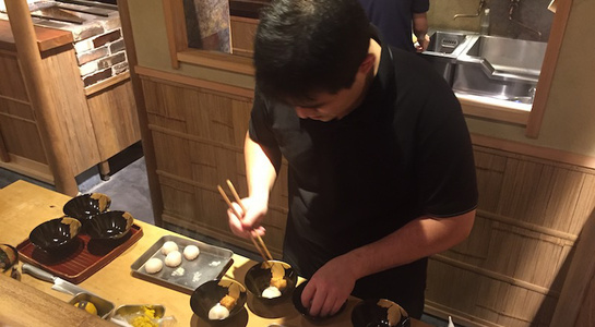 この日の椀物は「れんこん饅頭、車海老、菊花、椎茸(+三つ葉と柚)」という内容だったので、れんこん饅頭をつくる所からはじまり、吸い物と椀物の違いを視覚的に認識したり、茶懐石で大切になる「煮えばな」「ご飯」「湯桶(ゆとう)」の流れを実食したりしながら、実演はすすみました。所々で食べる際の作法なども習いつつ、裏千家・表千家でのマナーの違いを知ったり、甘味と抹茶の提供ルールなども学びました。甘みを食べ終えてから抹茶を出す流れは、デザートを食べきってから珈琲などを出すフレンチの作法とも通じている話が出たのは、異なるジャンルの料理人が集う八頭会ならではの会話でした。