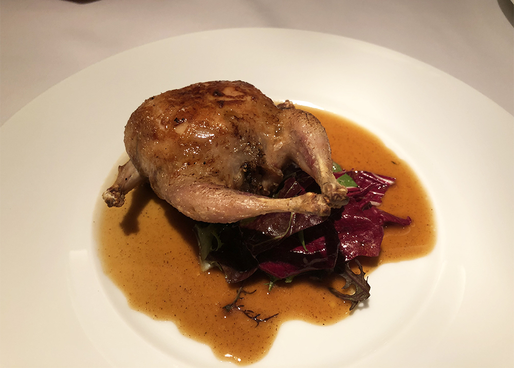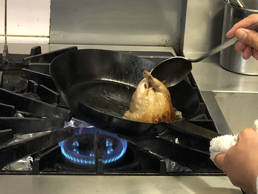 11月の八頭会は、カイユファルシ(フランス産うずらの詰め物)の実技をおこないました。まずはうずらの内臓や中骨を抜く「壺抜き」を川本シェフの見本を参考に実際に各人が包丁を握って実施。取り出したガラは香味野菜などと炒めてフォンドボーとあわせながらソースに。(実際は3時間ほど煮詰めていくため今回は流れだけ説明。)詰め物の中身は栗を使ったカレー風味のバターライスを用意し、塩・胡椒をしたうずらを今度はフライパンで焼き目をつけていくところも実演。油をまわしかけながらモモ肉には火を通し焼き目をつけてから、あとはオーブンで仕上げに。付け合わせのサラダには白ワイン、マスタード、エクストラバージンオリーブオイルを使いヴィネグレットソースのドレッシングをつくりました。
