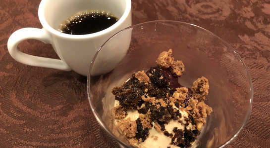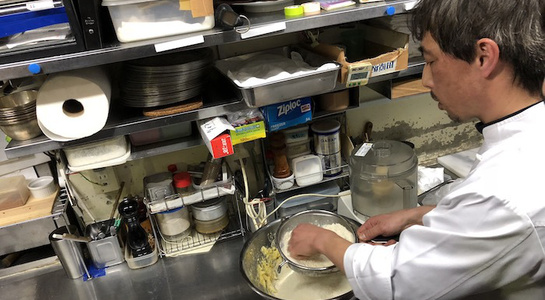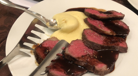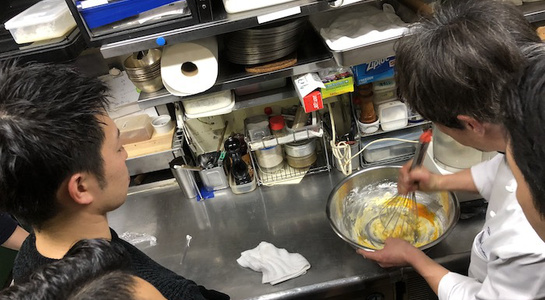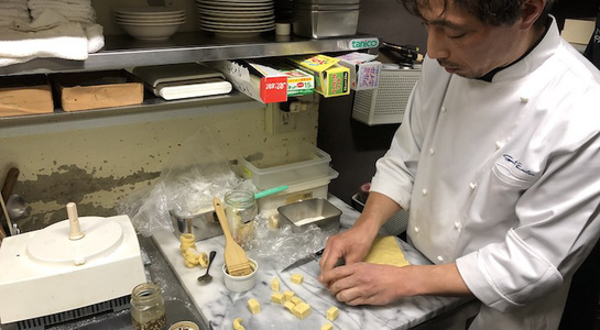 そのあとは厨房に移動し、グージェールをつくるところからはじまり、各種チーズを切り分け、蜂蜜(ロックフォールに)やイチヂクのコンポートを添えるなど、調理やアレンジを行いました。他にもマッシュポテトにチーズを溶かしたアリゴとステーキと一緒に試食。デザートはリコッタチーズをコーヒーのアイスと一緒に仕上げた一品で。やや苦手意識のある方もいましたが、今回はチーズの美味しさを再認識するような勉強会となり、今年の八頭会は閉幕となりました。次回はまた来年からの開催となります。