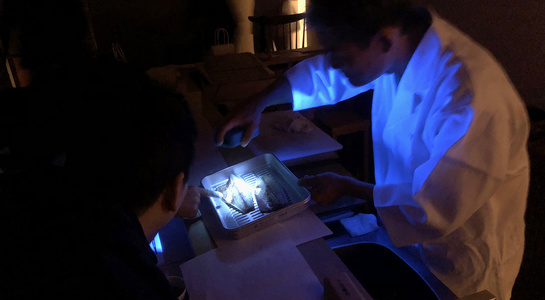 10月の八頭会。前半はHACCP(Hazard Analytics and Critical Control Point)について学ぶ、をテーマに開催。先日、二鶴の船橋さんが参加された勉強会の内容をもとに情報共有を行いました。なぜ、いまHACCPが日本に導入されようとしているのか、という背景のことや基準AとBの違い、店舗の衛生管理のノウハウ等を練習問題(テストケース)を実際にメンバーで答えながら勉強しました。さらに、鯖を実際に調理し、肉眼で確認した後にアニキサスに反応する特殊なライトで確認すると、肉眼では見えなかった個体を発見し驚きの声があがりました。