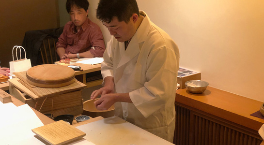 後半は鮨のにぎり方を実践。本手返し・小手返し・たて返しの3種類の違いを説明。特に本手返しは伝統の手法であり、鮨職人の方でも実践される方が少ない船橋さんが得意とする技。理想の鮨を握るためになぜ両手を使って握る、本手返しを選んだのかということと、握る手順を細部まで説明を聞きました。その後はメンバー全員が5貫のにぎりを実践。(みなさん二鶴さんの白衣を着て)各分野のプロのメンバーも、にぎりは初めての体験となりました。