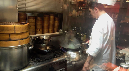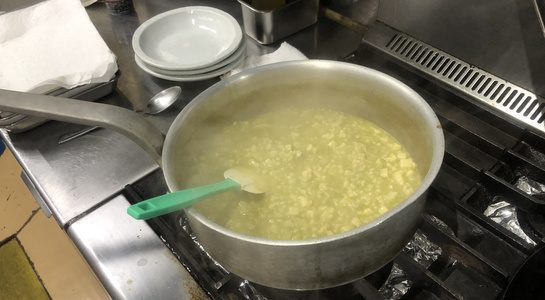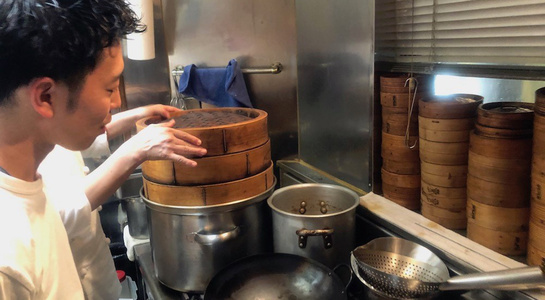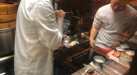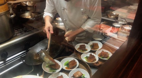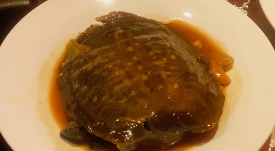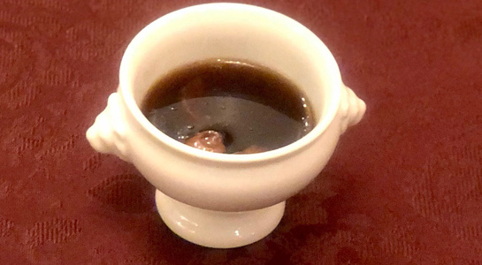 令和最初の6月八頭会のテーマは「中華の煮込み」。フレンチ、和の技法とはまた違う蒸籠を使う技法の利点を入江シェフが解説しながら会を進めていきました。今回は論理よりも実践メインで、まずは「あらかぶ」をフライパンにいれ塩をベースにしたスープに国産レモン、梅干し、香辛料などを入れて旨みをとじこめた「潮州料理(広東近郊エリア)」で提供。続いて、「すっぽん」の煮込みは肉主体ではなくエンガワや内臓を使ってスープを煮だしていく手法を披露。最後には、焼きをつけて味を閉じ込めておいた皮付きの豚肉を蒸籠で5時間蒸した「東坡肉(トンポーロー:豚の角煮)」で、蒸気の力でソースが煮詰まることなく素材にゆっくりと染みこませていく手法を味わいました。