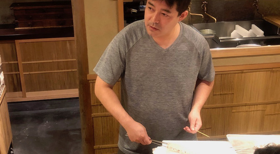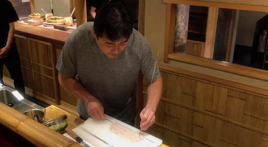 7月の八頭会は「ハモと器をテーマ」に。まずはハモの骨切り(皮を切らないように細かい切り込みをいれて小骨を切っていく技法)のタイミングや事前の仕込みについての話からスタート。骨切りしたハモに串打ちしてから、皮目を炙るまでを実演。続いては骨切りをしつつ切り分けていき、葛粉をうって下ごしらえ。最後は骨切りを終えてから皮を剥いてから寿司ネタ用の仕込みに。
