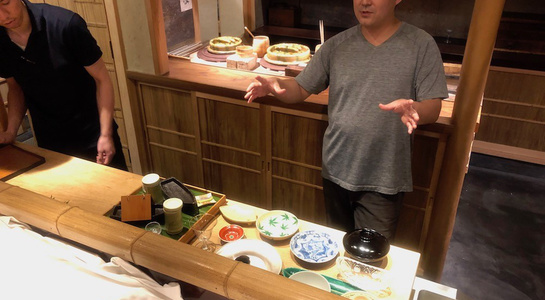 器については、今月馳走なかむらで使っている、突き出し、碗、造り、八寸、焼き物、炊き合わせ、ごはん、果物の一揃えを出して、それぞれを説明。お膳を料理からデザートで替えるか替えないか、で料理家の格が変わるという話。毎月器を変える時には使う器をすべて並べて全体像を把握するのが大事という話。季節感の演出とお客様の目線や器への印象の持たせ方の話。器を選ぶ時(買う時)の考え方のことなど興味深い話がたくさん出ました。