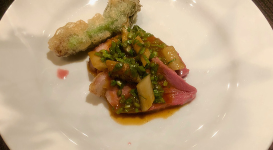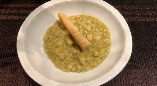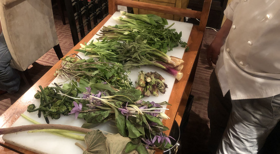 その後の実食は各種山菜をただ茹でたものを塩で味見しつつ、タケノコとふきのとうのリゾット、鴨・セリ・たらの芽のフリットの一皿、を味わいました。