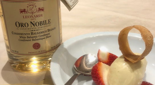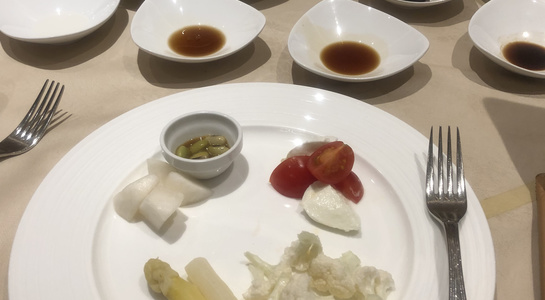 第二部は蕪・白アスパラガス・カリフラワー・トマトとモッツアレラチーズ、フランスパンなどのシンプルな食材で各種の酢を食べ比べを実施。最後にはデザートに4年熟成の白バルサミコ酢をかけて試食をおこないました。