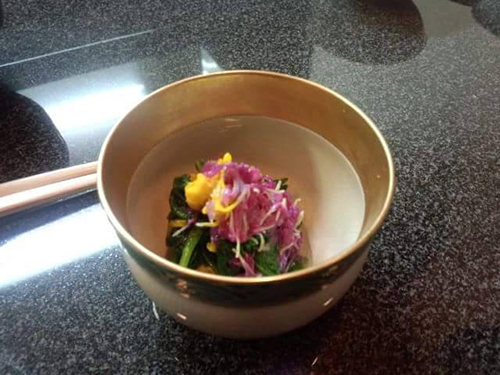 前回の勉強会で習った油をつかい「ナッツオイルでネギ油をつくり、玉子を使用した前菜で使用」「魚料理にネギ油をかけて使用」「パウダーにして使った他、クルミ油・ナッツ油の2種類で作って使用」「カキのオイル漬けに使用したり、ポン酢と合わせふぐの叩きに使用したりした」と各自が自分のお店の料理に取り入れたことを発表し合った。