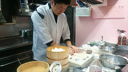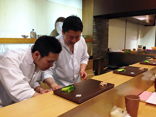 2015年最初の勉強会は寿司つばさとエタンセールカワモトのコラボレーションで、テーマは「フレンチの食材を用いた寿司」。お品書きは「赤ワインを使用したマグロの漬け」「カワハギの肝をパウダー状に…」「白子の握りにポン酢のムースリーヌ」「シードルビネガーを使用した鯖の〆」「渡りがにの茶碗蒸し ビスク風」。食材の組み合わせだけでなく、真空調理器・パコジェットといった新しい時代の調理器と、伝統の技を組み合わせることにも挑戦した。