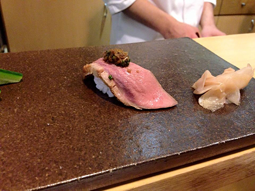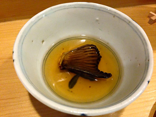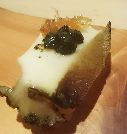 江戸前すしがどのように過去の鮨文化から派生し、いまのように鮨の主流となったのか、といった歴史考察などを含むレクチャーが江戸前鮨 二鶴 船橋が講師役からあった。当日のメニュー3月の反省をふまえて「蒸し鮑の鮨」「蒸し鳥の鮨」「豚足の煮こごりの鮨」など。一通りのメニューを出した後は、パクチーを二鶴の舎利に混ぜて握った鮨という実験的な試みも行われた。