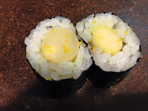 当日のメニューは「舎利のサラダ仕立て(舎利×豚肉の煮こごり×卵焼き×トマト×アボガド)」「舎利の玉子春巻き(舎利×香草×かんぴょう)」「魚羹スープの寿司」「舎利の豚肉のせ」「炒飯」など、江戸前鮨と中華料理をコラボレートさせた内容となった。