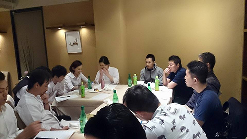 初の主催イベントを終えての意見交換会が実施された。「完成度が高かったが、お酒は日本酒メインのほうがよかったかもしれない。最終的なご飯はバターライスではなく、白ごはんでもよかったのかも」「サービスが大変勉強になり、最後はおなかいっぱいになった」「一斉スタートではないのに流れがスムーズで全体的に感動したが、少し量が多かった」「オーダーを通す人間がはっきりしていなかった」「スタートがバラバラだったのでまとめてオーダーがかけられなかった。料理のオーダーを合わせるのは難しかった」「メニューのフォーマットは今回のものを基礎に見開きでメニュー+ドリンクメニューを用意するのなどの配慮があればよかった」といった意見が、八頭会メンバーと担当2店のスタッフメンバーから挙がった。