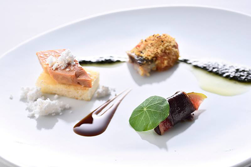 当日のメニューは「コンソメを酢の物仕立て 春野菜と」「スクランブルエッグとホワイトアスパラ 蕗の茎」「トラフグの煮こごり ふぐのエスプーマ」「フォアグラの田楽」「鴨味噌漬け」。「コンソメ×淡口醤油×生姜×カボス」「フグのダシ+柚子をエスプーマ」「フォアグラ×竹の子」「味噌×マーマレード」など和とフレンチ両方の技法をあわせたメニューが並んだ。