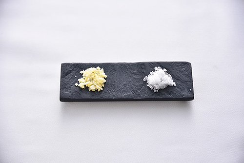 1月のコラボレーションのリベンジとして同じ組合せで再挑戦。メニューは「カマスは塩をして焼き霜に(ヘーゼルナッツ、オリーブオイル+カボスポン酢、マイクロベビーリーフ)」「鰺、エシャロット、肥後味噌、温野菜は塩ゆでしてオリーブオイル和え」「鴨ロースト、薬味は白ネギ、浅葱、生姜醤油」「西米良サーモンの昆布締め、オランデーズソース」「サーモン燻製漬け」。