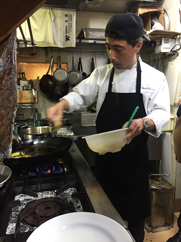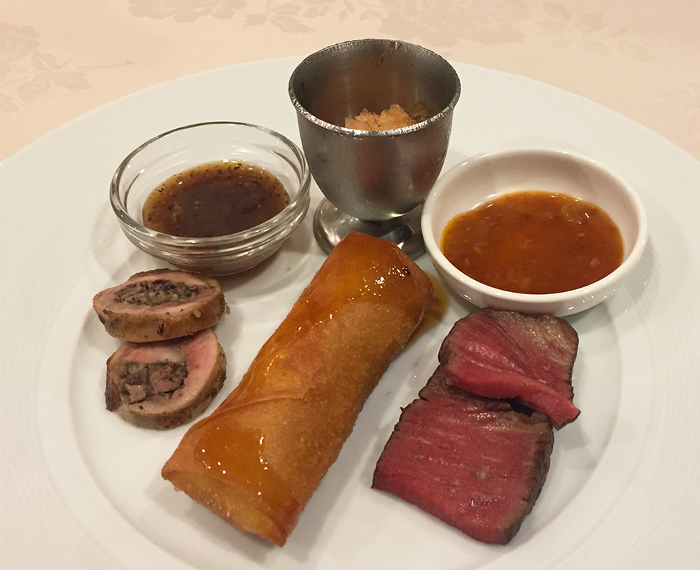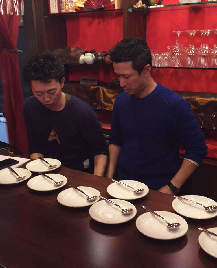 メニューは「フォアグラのソテーとキャベツの煮込みの春巻き」「うずらのローストと牛フィレのローストを中華のソースで(黒胡椒と沙茶醤ソース)」「プーアル茶のグラニテ」。試食後はメニューの完成度を高めるべく、各料理人からのアドバイスがあり、さらに当日に向けてのメニュー改良案を交換しました。