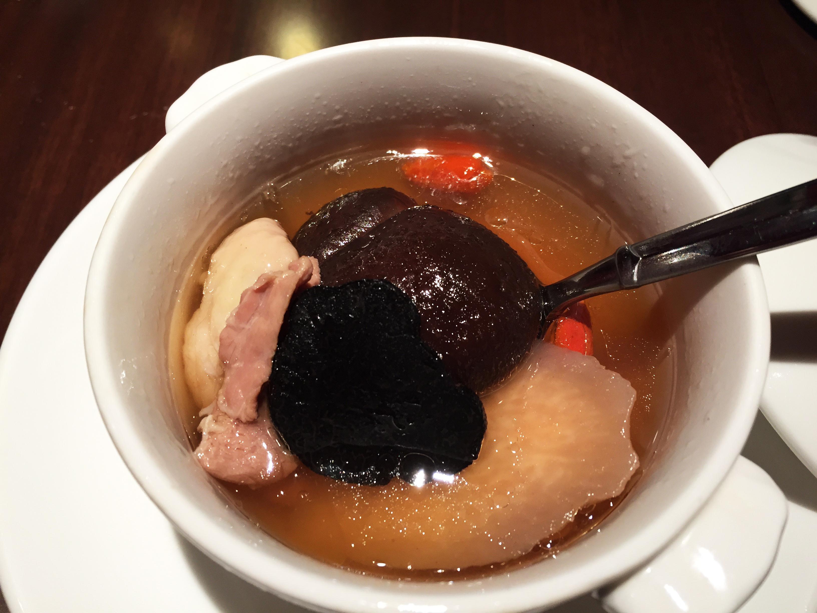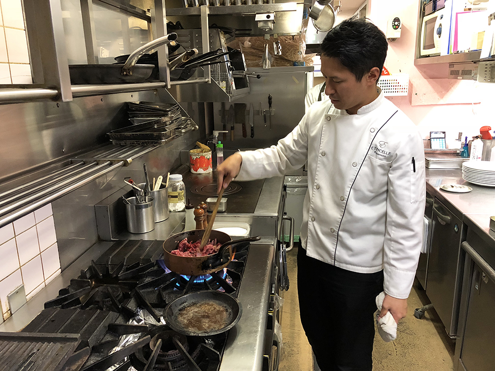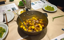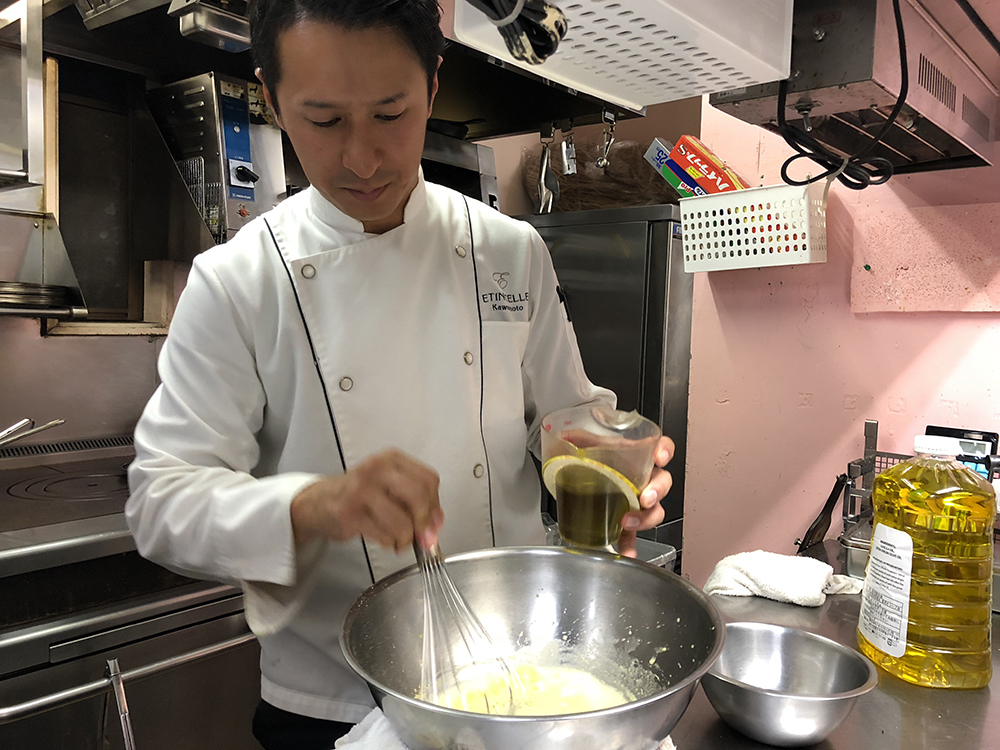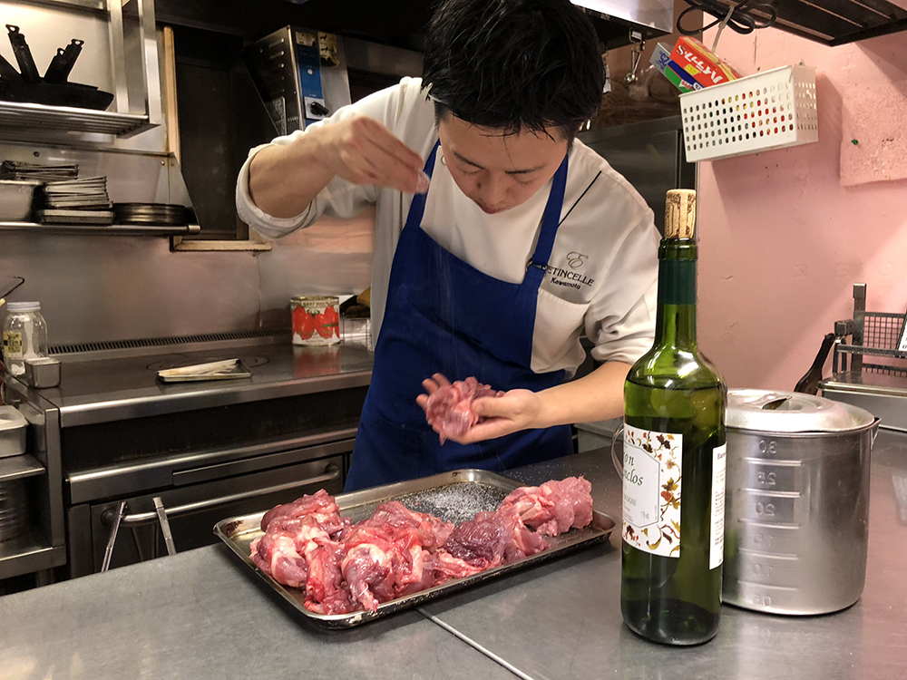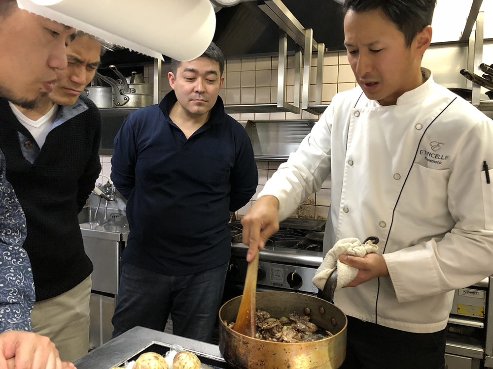 試食メニューは「 RONの薬膳蒸しスープ(干し椎茸、干し山芋、くこ、金華ハムなどを 3時間ほど蒸したスープに黒トリュフをいれて)」と「豚肉とエビのワンタンにエタンセールカワモトのソースアメリケーヌトシャンピニオンの泡で(ワンタンをラビオリと捉えて)」の2品。この試作料理に対して各料理人の視点からメニューについての意見交換を行い、 4月もエタンセールカワモトで継続してコラボメニュー試作を続けることになりました。