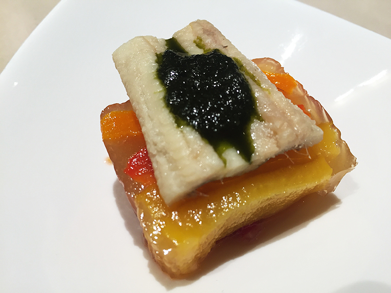 フリットはアスパラ、鶏肉、フォアグラなどを3種類の異なる生地と様々な種類の塩やスパイス塩などで試食しました。(試食は他に鮎のパテ、野菜と穴子のテリーヌも。)