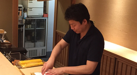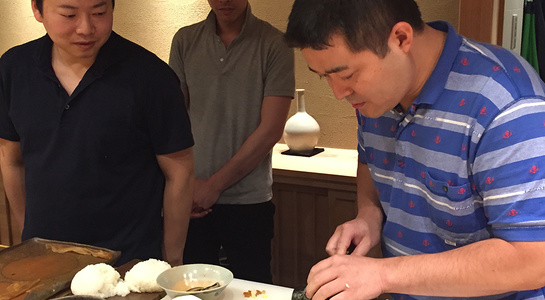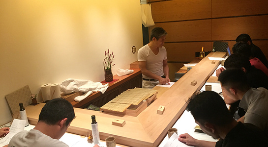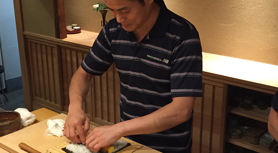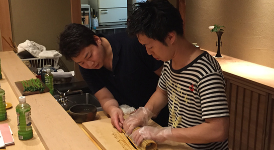 6月八頭会は寿司つばさにて巻き寿司と箱寿司の勉強会を開催しました。まずは、巻き寿司の「おぼろ」「椎茸」「かんぴょう」といった具材のつくり方、紙とタオルを使った巻き方の説明、実際の具材を使っての巻きから切るまでの実演後、メンバー各人も巻き寿司づくりに挑戦しました。(合間には江戸前鮨の二鶴さんとつばささんによる関西、関東の巻き寿司・太巻きの違いの話も。)