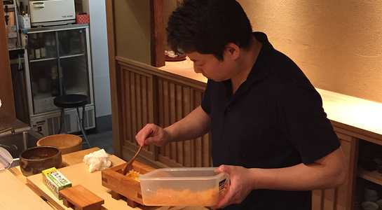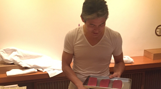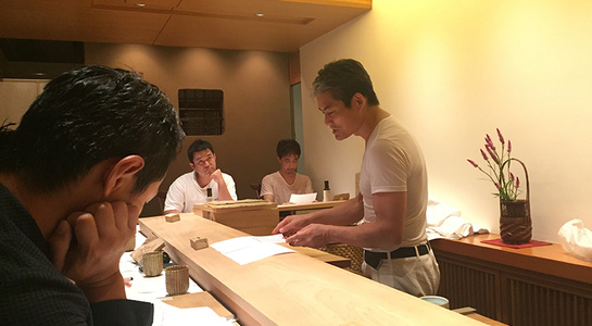 そして、同じマグロの赤身を3段階(当日、4日目、8日目)に日にちをわけて解凍保存させておき、味の違いを鮨で試食し、「食材と味の変化を化学的に考える」という8月の勉強会を終了しました。(この日は、おまけで「ハムとトマトの手巻き寿司」「魚だしの冷製ラーメン」のまかないも試食。)