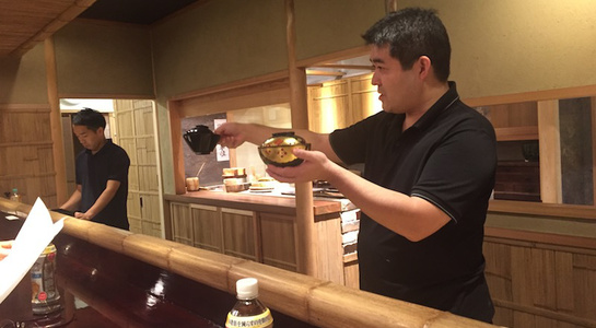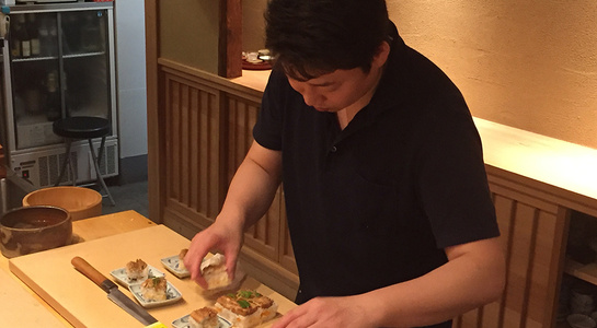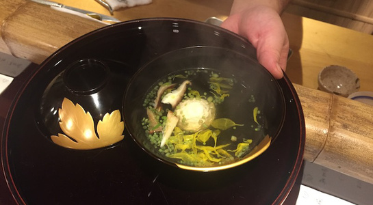 10月の八頭会は馳走なかむら主人、中村さんによる「椀物〜懐石料理と会席料理の違い」を学ぶ勉強会を開催しました。日本料理の中でも出しの技術、季節感、椀(器)の選び方など料理人としてのセンスや技量が最も問われる、椀物。煮物椀の基本的な構成の話からはじまり、茶会料理の懐石会席と宴会料理的な会席料理における「煮物椀」「ご飯」の出る順番の違いや歴史的な成り立ち、もてなしの意義といった座学をまず行い、それから実演となりました。