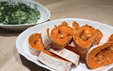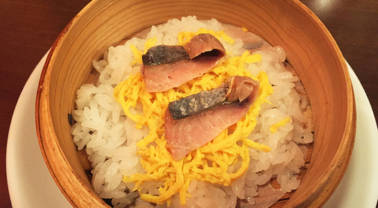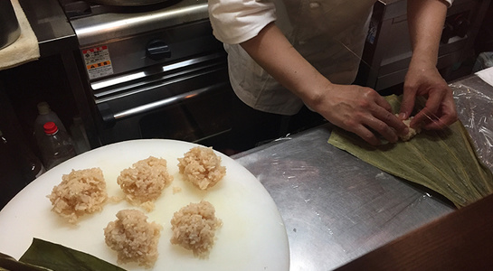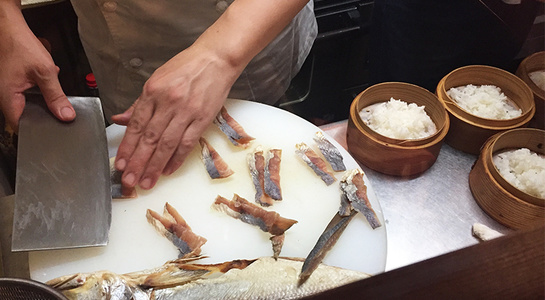 おまけは鮨のシャリと水で戻した乾燥したハスの葉を使った蒸し鮨、香港などで使われる発酵させた魚:鹹魚ハムユを使った蒸し鮨の2種類も。蒸すことで香りが変化する中華の技法を堪能できる授業でした。