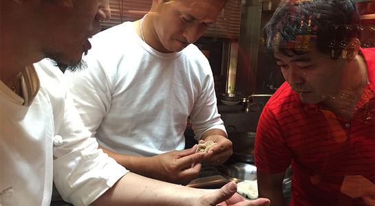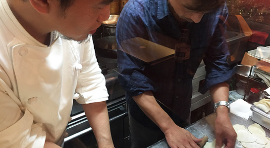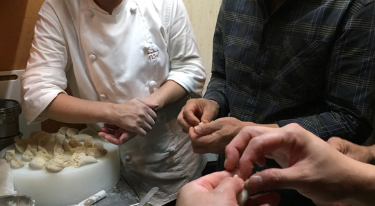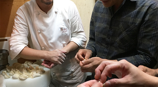 9月の八頭会はビストロチャイニーズRON、入江シェフの指導の下、点心を包む実技を開催。最初はオリジナルの餡をつかった餃子。餡をいかにしっかりと餡を包み込むか、ヒダを上手につくっていくのか、ということを直接指導でメンバーが一人一人実技を行いました。続いて、小籠包を皮からのばして餡を詰めていく作業を実演。フレンチ、寿司、和食と分野の違うメンバーは日頃の仕事とは違う料理の作り方がとても勉強になったようです。