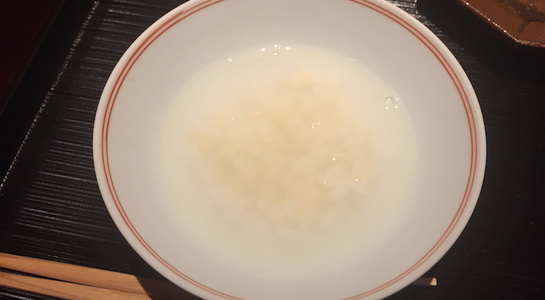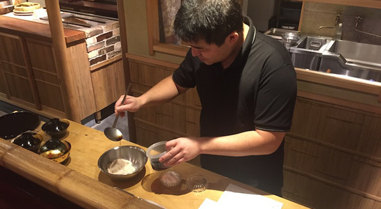 この日の椀物は「れんこん饅頭、車海老、菊花、椎茸(+三つ葉と柚)」という内容だったので、れんこん饅頭をつくる所からはじまり、吸い物と椀物の違いを視覚的に認識したり、茶懐石で大切になる「煮えばな」「ご飯」「湯桶(ゆとう)」の流れを実食したりしながら、実演はすすみました。所々で食べる際の作法なども習いつつ、裏千家・表千家でのマナーの違いを知ったり、甘味と抹茶の提供ルールなども学びました。甘みを食べ終えてから抹茶を出す流れは、デザートを食べきってから珈琲などを出すフレンチの作法とも通じている話が出たのは、異なるジャンルの料理人が集う八頭会ならではの会話でした。
