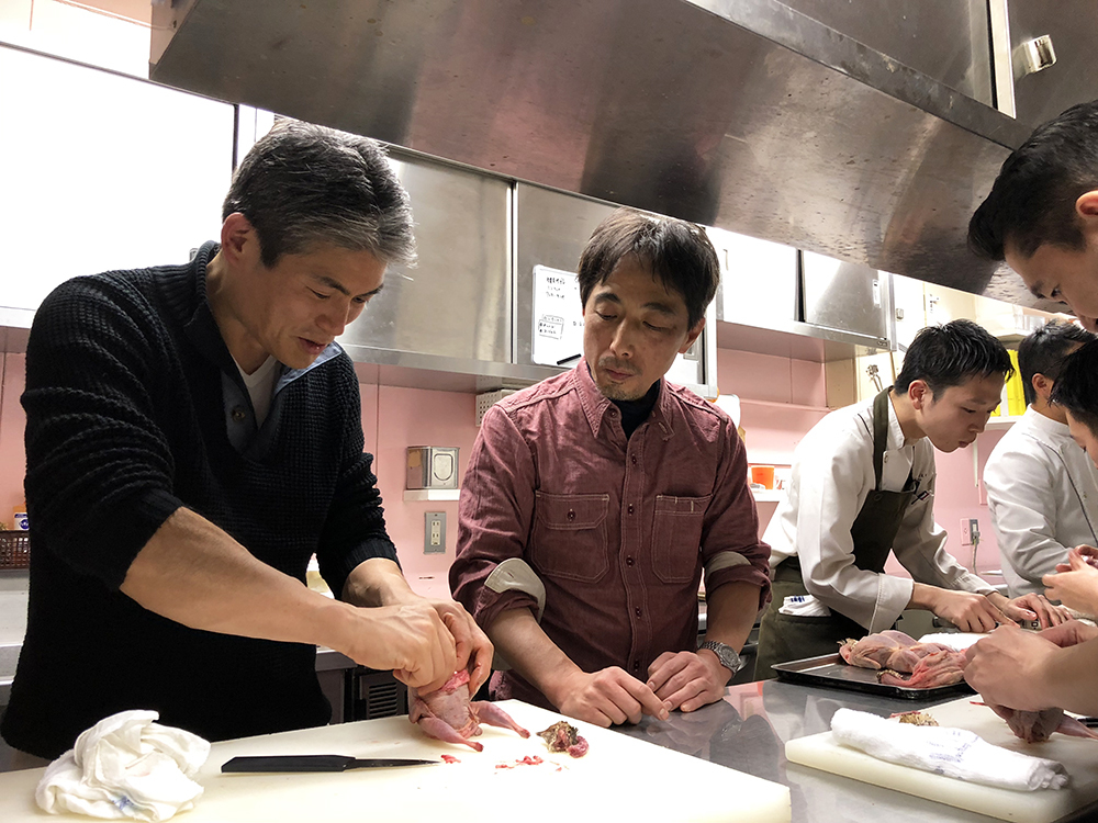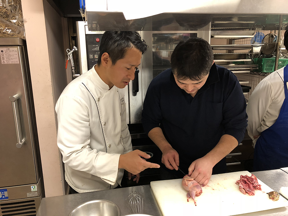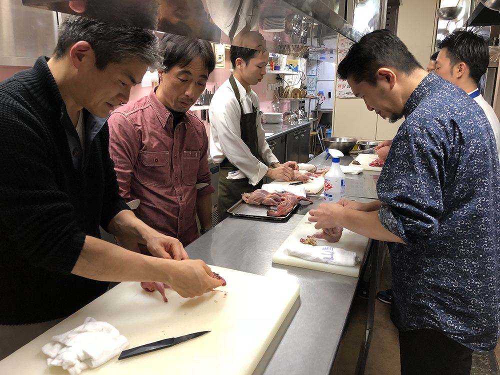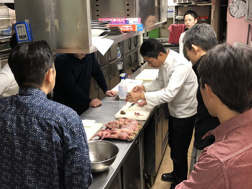11月の八頭会は、カイユファルシ(フランス産うずらの詰め物)の実技をおこないました。まずはうずらの内臓や中骨を抜く「壺抜き」を川本シェフの見本を参考に実際に各人が包丁を握って実施。取り出したガラは香味野菜などと炒めてフォンドボーとあわせながらソースに。(実際は3時間ほど煮詰めていくため今回は流れだけ説明。)詰め物の中身は栗を使ったカレー風味のバターライスを用意し、塩・胡椒をしたうずらを今度はフライパンで焼き目をつけていくところも実演。油をまわしかけながらモモ肉には火を通し焼き目をつけてから、あとはオーブンで仕上げに。付け合わせのサラダには白ワイン、マスタード、エクストラバージンオリーブオイルを使いヴィネグレットソースのドレッシングをつくりました。