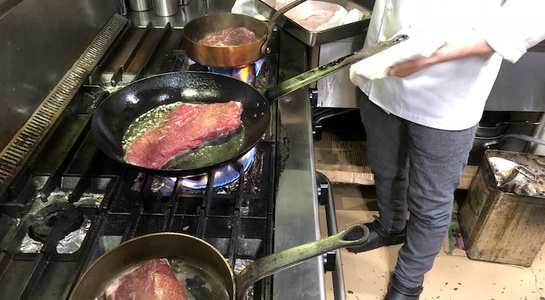 まず、牛肉と鴨肉の低温調理は表面をゆっくりと焼き、それからコンベクションオーブンへ。塩・胡椒の種類と使うタイミングの違いなどについても細かな質問が飛び交いました。(これとあわせて魚の低温調理も簡単に実演。)