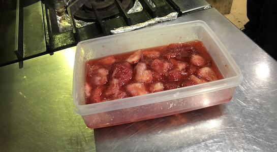 続いてコンフィチュールは、午前中から砂糖とトレハロースで水出しした苺を使い、温度をはかりながらペクチンを加えながら調理し、最後にはレモンを加えて仕上げ。