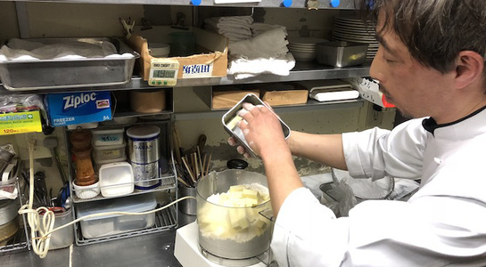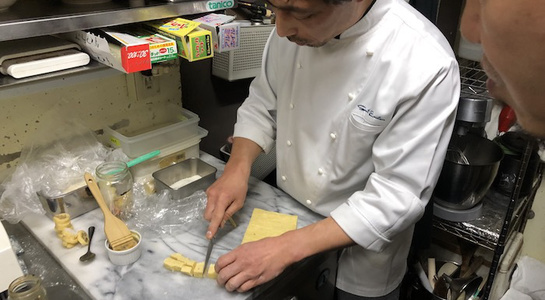 サブレはバターを多めに使ったアーモンドプードル入りの生地は手作業で混ぜていき、もう一種類のバターが少ない生地はロボクープを使い攪拌。実際には1日ほど生地を寝かす必要もあるので、事前に作っておいた生地を取り出して、少し変わり種でグリーンペッパーやクミンを使った仕上げに。それとは別に三日月型につくるキプフェルは、和三盆やバニラシュガーで仕上げるなどバリエーションを幾つか作りながら、作り方を学びました。
