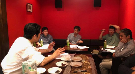 10月の八頭会。前半はHACCP(Hazard Analytics and Critical Control Point)について学ぶ、をテーマに開催。先日、二鶴の船橋さんが参加された勉強会の内容をもとに情報共有を行いました。なぜ、いまHACCPが日本に導入されようとしているのか、という背景のことや基準AとBの違い、店舗の衛生管理のノウハウ等を練習問題(テストケース)を実際にメンバーで答えながら勉強しました。さらに、鯖を実際に調理し、肉眼で確認した後にアニキサスに反応する特殊なライトで確認すると、肉眼では見えなかった個体を発見し驚きの声があがりました。