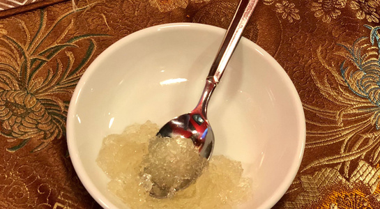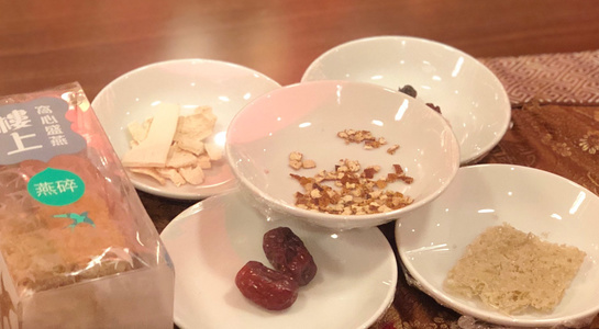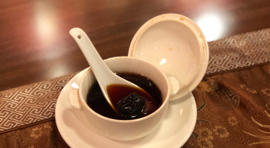 後半は薬膳料理の試食。「スープ(枸杞、棗、干し貝柱、干し山芋を小さな器にいれて3時間ほど蒸した一皿)」「炒め物(赤茎ほうれん草、陳皮、豚肉)」「蒸し鶏(枸杞、ネギ、生姜)」「デザート(甘く煮たつばめの巣)」といった4つの料理を楽しみました。