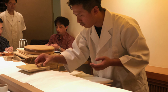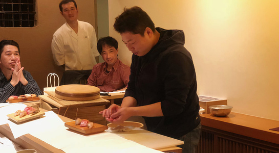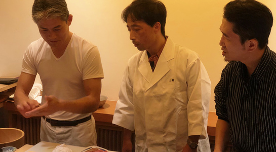 後半は鮨のにぎり方を実践。本手返し・小手返し・たて返しの3種類の違いを説明。特に本手返しは伝統の手法であり、鮨職人の方でも実践される方が少ない船橋さんが得意とする技。理想の鮨を握るためになぜ両手を使って握る、本手返しを選んだのかということと、握る手順を細部まで説明を聞きました。その後はメンバー全員が5貫のにぎりを実践。(みなさん二鶴さんの白衣を着て)各分野のプロのメンバーも、にぎりは初めての体験となりました。