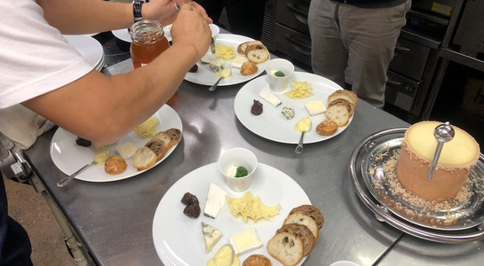 そのあとは厨房に移動し、グージェールをつくるところからはじまり、各種チーズを切り分け、蜂蜜(ロックフォールに)やイチヂクのコンポートを添えるなど、調理やアレンジを行いました。他にもマッシュポテトにチーズを溶かしたアリゴとステーキと一緒に試食。デザートはリコッタチーズをコーヒーのアイスと一緒に仕上げた一品で。やや苦手意識のある方もいましたが、今回はチーズの美味しさを再認識するような勉強会となり、今年の八頭会は閉幕となりました。次回はまた来年からの開催となります。