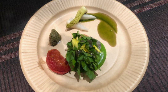 今回からテーマに対して各メンバーがテーマにあわせた料理を持ち寄ることもはじめたので、エタンセールカワモトが春の魚クレソンのソース、タプナードとふきのとう、たらの芽のピクルスの一皿を、江戸前鮨 二鶴がわさびの葉の細巻きをつくりました。
