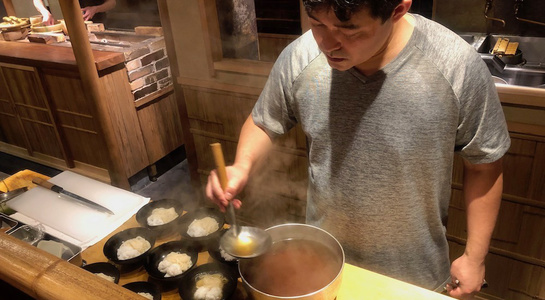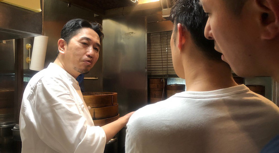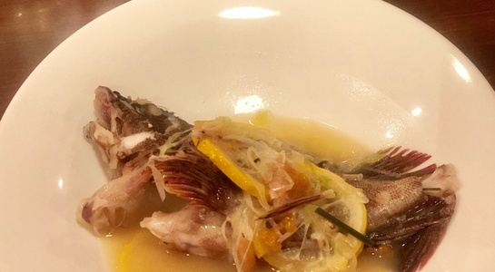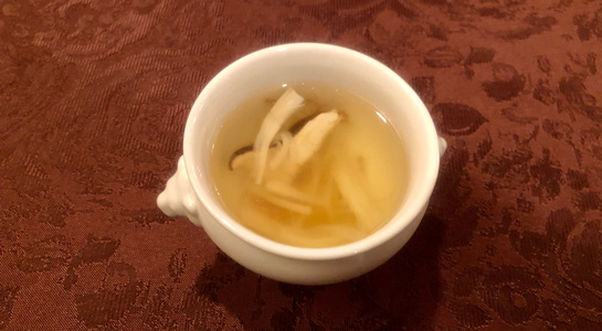 令和最初の6月八頭会のテーマは「中華の煮込み」。フレンチ、和の技法とはまた違う蒸籠を使う技法の利点を入江シェフが解説しながら会を進めていきました。今回は論理よりも実践メインで、まずは「あらかぶ」をフライパンにいれ塩をベースにしたスープに国産レモン、梅干し、香辛料などを入れて旨みをとじこめた「潮州料理(広東近郊エリア)」で提供。続いて、「すっぽん」の煮込みは肉主体ではなくエンガワや内臓を使ってスープを煮だしていく手法を披露。最後には、焼きをつけて味を閉じ込めておいた皮付きの豚肉を蒸籠で5時間蒸した「東坡肉(トンポーロー:豚の角煮)」で、蒸気の力でソースが煮詰まることなく素材にゆっくりと染みこませていく手法を味わいました。