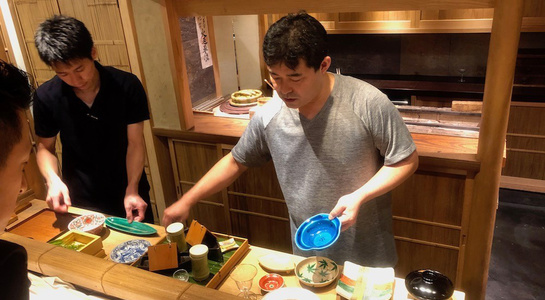 器については、今月馳走なかむらで使っている、突き出し、碗、造り、八寸、焼き物、炊き合わせ、ごはん、果物の一揃えを出して、それぞれを説明。お膳を料理からデザートで替えるか替えないか、で料理家の格が変わるという話。毎月器を変える時には使う器をすべて並べて全体像を把握するのが大事という話。季節感の演出とお客様の目線や器への印象の持たせ方の話。器を選ぶ時(買う時)の考え方のことなど興味深い話がたくさん出ました。